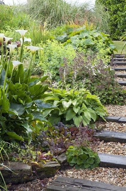 Dit borderpakket is samengesteld met planten die altijd voldoende vocht tot hun beschikking willen hebben. Dit laten ze zien met een weldadige groei en groot blad. Bij dit borderpakket is er ook gelet op bladcombinatie en hoogte. Het nagelkruid Geum heeft het bijzonder naar zijn zin op natte grond. Zijn zaailingen staan al langs de trap. De grote witte kelken zijn van de callalelie Zantedeschia, de vorm van het glanzende blad komt terug bij de hartlelie Hosta. Net achter de toefjes zachtgele vrouwenmantel Alchemilla staat het grote ronde blad van schildblad Darmera. Grote pollen prachtriet Miscanthus sluiten de border af.
